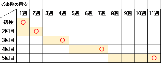 1回目は初検時、2回目は初検の施術から1週間後、3回目は2回目の施術から2週間後、4回目は3回目の施術から3週間後と 少しずつ間隔を延ばしていきます。はじめのうちは整体で矯正した姿勢が元の状態に戻りやすいので、間隔を詰めてお越しいただくことを推奨しています。だんだんと身体が正しい姿勢になっていくに従い間隔をあけていき、調子の良い状態を1ヶ月間保てれば、姿勢の定着ができていると判断します。その後は月に1度程度の身体のメンテナンスとして通っていただくことをおすすめしています。現在、当鍼灸整骨院に通われている人の多くは、メンテナンスでご利用頂いております。